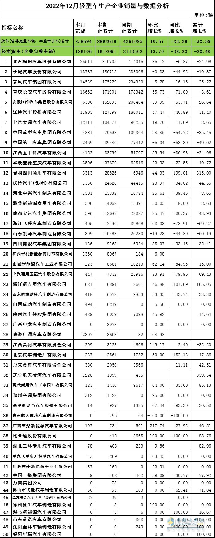 2022年12月輕卡企業(yè)銷量與數(shù)據(jù)分析