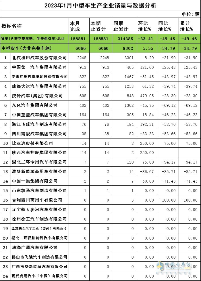 2023年1月份中型貨車完成銷量6066,環(huán)比增長(zhǎng)5.55%,同比增長(zhǎng)-34.79%,累計(jì)增長(zhǎng)-34.79%。排名前三的企業(yè)為北汽福田汽車股份有限公司、中國(guó)第一汽車集團(tuán)有限公司、安徽江淮汽車集團(tuán)股份有限公司。