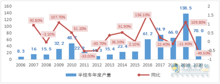 2021年起,在國內(nèi)整體經(jīng)濟(jì)疲軟等綜合因素的影響下,國內(nèi)半掛車需求收縮,2022年半掛車年銷量僅約39萬輛,市場需求減半。