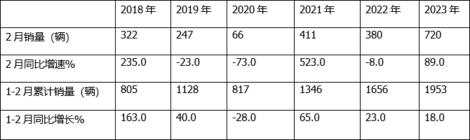 上表可見,在近6年的2月的房車銷量中,2023年2月的銷量為720輛,是近年同期最高的月份,同比增長89%,增幅居近6年同期第三。