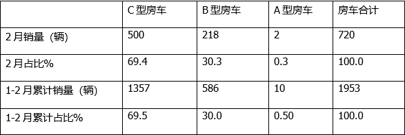 總之,無論是今年2月還是1-2月,房車市場均呈現(xiàn)C型房車和B型房車二元結(jié)構(gòu),A型房車幾乎可以忽略。