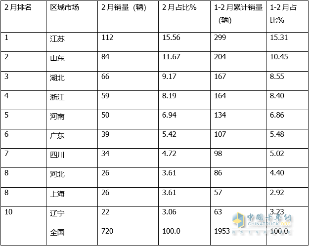 從1-2月累計(jì)銷量看,江蘇、山東兩個(gè)區(qū)域累計(jì)銷量超200輛,銷量分別為299輛和204輛,市場占比分別為15.31%和10.45%,分別居第一、第二。其余區(qū)域累計(jì)銷量均在200輛以下。
