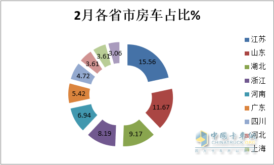 表5,根據(jù)終端上牌數(shù)據(jù),2023年2月房車區(qū)域市場銷量中,江蘇、山東、湖北居前三。TOP10銷量統(tǒng)計(jì)如下: