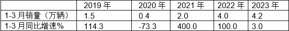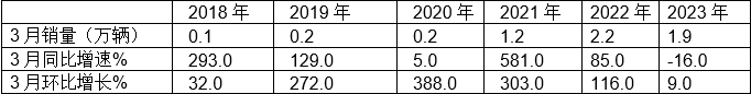 一是去年3月銷量基數(shù)(2.2萬(wàn)輛)是近年同期最高的月份,給今年3月同比增長(zhǎng)帶來(lái)壓力;
