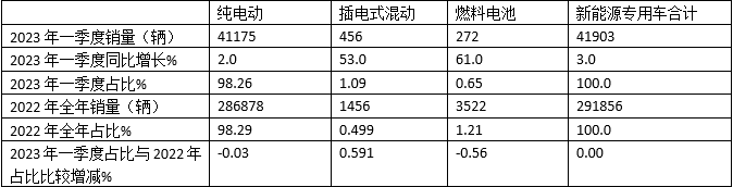 2023年一季度累計(jì)銷售新能源專用車4.2萬(wàn)輛,同比增長(zhǎng)3%。