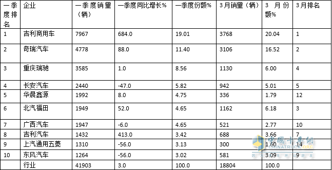 特點(diǎn)六:一季度吉利商用車領(lǐng)跑領(lǐng)漲,奇瑞、瑞馳分列二、三;3月吉利商用車、奇瑞、福田居前三