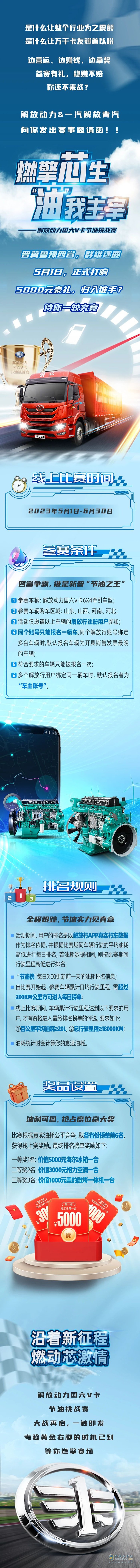 燃擎芯生,“油”我主宰!2023年5月1日,解放動(dòng)力國(guó)六V卡節(jié)油挑戰(zhàn)賽火熱開賽。