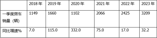 上表可見,在近6年一季度的房車銷量中,2023年的銷量為3209輛,為最高。從同比增幅看,其增幅為32.2%,居近6年同期第四高。
