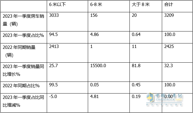 ----2023年一季度8米段以上房車累計銷售20輛,銷量同比增長81.8%,市場占比0.64%,居最小,占比同比增加0.19%,是占比同比增加第二多的細分車型。