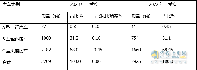 表3,根據(jù)終端上牌數(shù)據(jù),按產(chǎn)品類別劃分,2023年一季度各類房車銷量、占比及占比同比增增減: