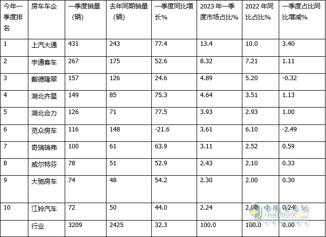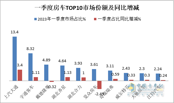 上圖表顯示,在2023年一季度房車累計銷量TOP10中: