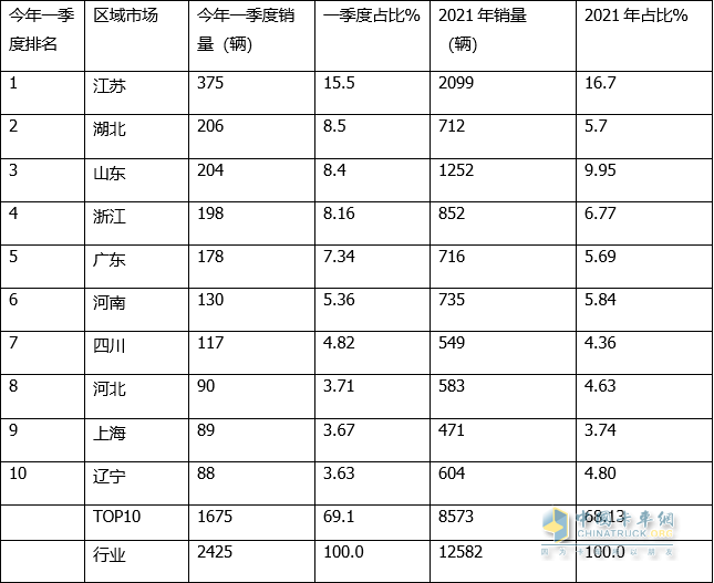 表5,根據(jù)終端上牌信息,2022年一季度銷量TOP10區(qū)域排行: