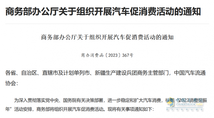 2023年6月8日,國家商務部發(fā)布《關于組織開展汽車促消費活動的通知》(以下簡稱《通知》)?!锻ㄖ访鞔_,在2023年6月至12月期間,開展“百城聯(lián)動”汽車節(jié)和“千縣萬鎮(zhèn)”新能源汽車消費季活動。