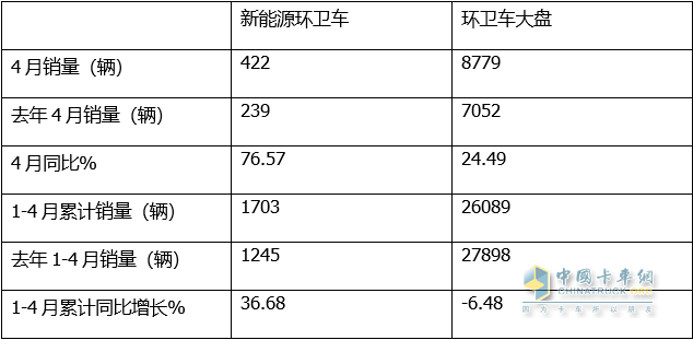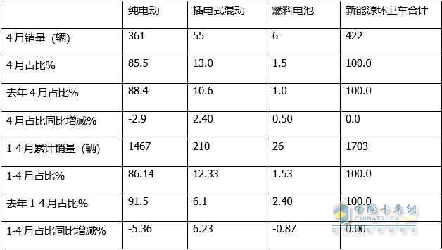 上表顯示:在今年4月及1-4月各類新能源環(huán)衛(wèi)車銷量及占比中:
