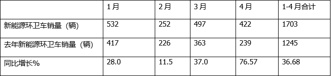 ---今年4月新能源環(huán)衛(wèi)車銷量同比增長(zhǎng)76.57%,跑贏今年4月環(huán)衛(wèi)車大盤24.49增速近52.08個(gè)百分點(diǎn);