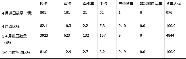 上表顯示,2023年4月及1-4月貨車進(jìn)口市場中: