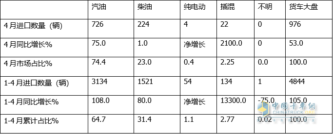 上表顯示,在2023年4月及1-4月各類動力貨車進(jìn)口市場中: