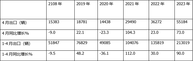 上表顯示,2023年4月及1-4月貨車分別出口55184輛和213019輛,分別創(chuàng)近6年4月和1-4月新高(同比增幅分別為73%和90%,均居近年4月和1-4月第二)。據(jù)分析主要得益于我國卡車性價比較高及海外投資模式的變化。