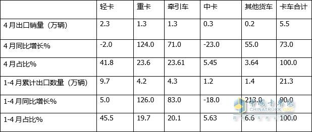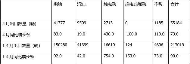 上表顯示,2023年4月及1-4月各種動力貨車出口: