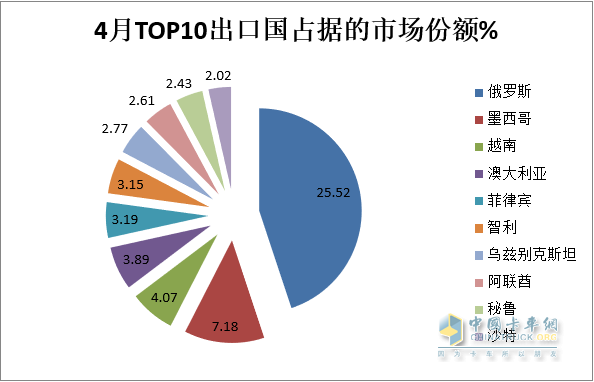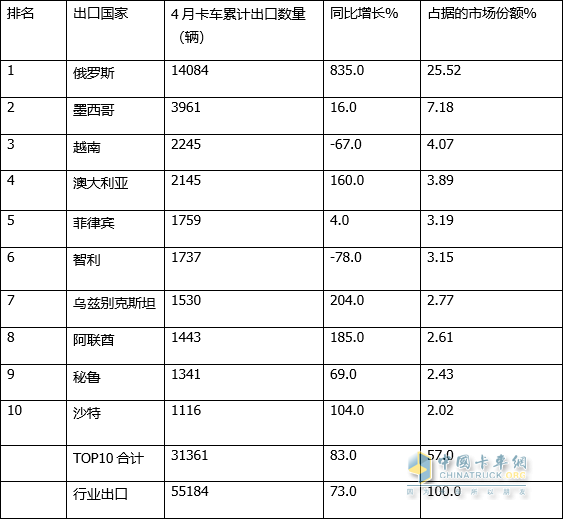 ---在2023年4月貨車出口國TOP10中,俄羅斯是唯一出口超過10000輛的國家,居第一;同比暴漲835%,增速最猛,領(lǐng)漲各個出口國;市場占比25.52%,領(lǐng)跑我國4月所有貨車出口國。