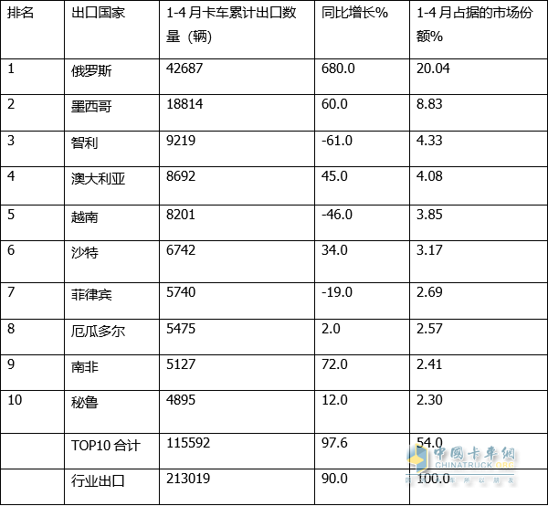 ---在2023年1-4月貨車出口國TOP10中,俄羅斯是唯一出口超過40000輛的國家,居第一;同比暴漲680%,增速最猛,領(lǐng)漲各個出口國;市場占比20.04%,領(lǐng)跑我國1-4月所有貨車出口國。