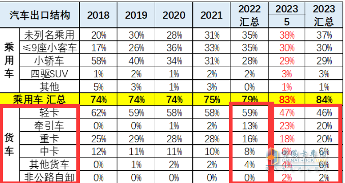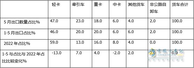 表2,根據(jù)中國汽車流通協(xié)會數(shù)據(jù)(截圖2),2023年5月及1-5月貨車各細(xì)分市場出口數(shù)量及占比、2023年1-5月占比與2022年占比比較: