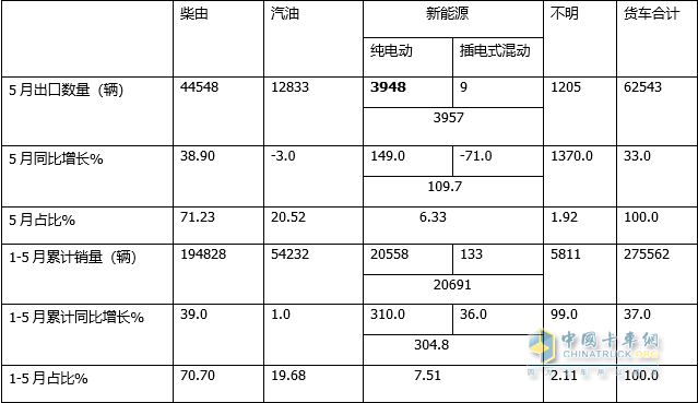 總之,無論是2023年5月還是1-5月,柴油貨車出口占比均超7成,均居于絕對的主體地位,新能源出口同比均領(lǐng)漲貨車大盤。