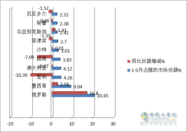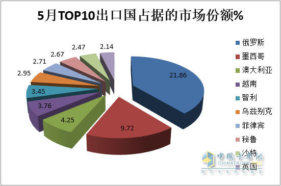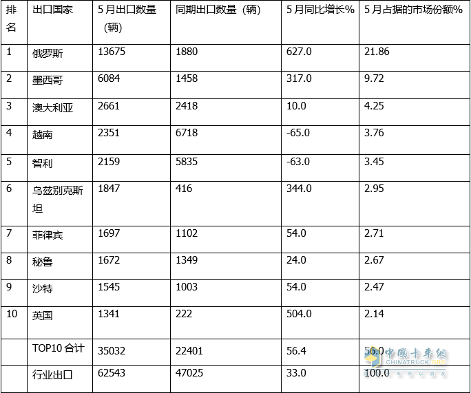 ---出口俄羅斯最多,也是唯一超出10000輛的國家,同比增長627%,領(lǐng)漲出口大盤,市場份額為21.86%,居榜首;是推動2023年5月我國卡車出口同比增長的核心力量之一;