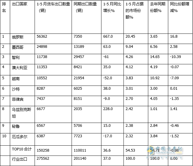 據(jù)分析主要海外各國入境政策逐步放松,前期積壓的剛性運輸需求逐步釋放,特別是俄羅斯和墨西哥等國家近期進(jìn)口我國卡車數(shù)量同比暴漲,有力推動了我國今年前5月貨車海外出口市場的增長。