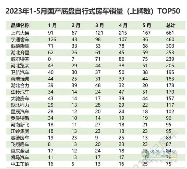 1、在2023年1-5月房車?yán)塾嬩N量TOP10中: