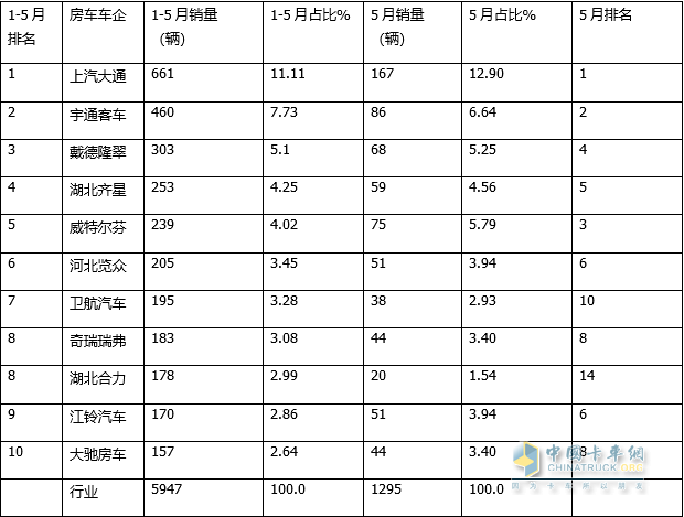 總之,在今年5月及1-5月房車市場中,上汽大通和宇通客車均奪得單月、累計“雙料”冠亞軍,這是當(dāng)下國產(chǎn)底盤自行式房車市場競爭領(lǐng)域的一個明顯特征。