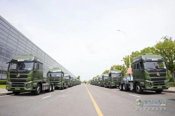 2023年7月26日,三一智聯(lián)重卡產(chǎn)業(yè)園內(nèi)的交付儀式圓滿完成,首批100臺“軍綠色”新英才黃金版460整齊列陣,齊聲鳴笛,一同北上開往大美新疆。