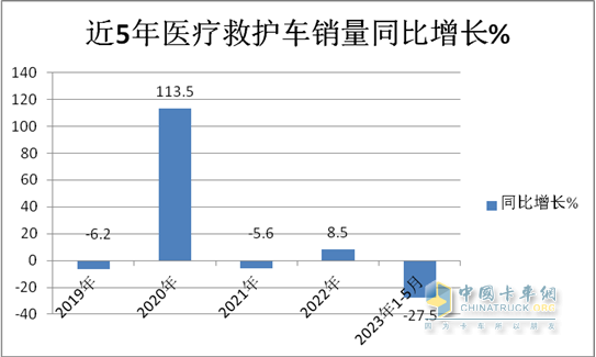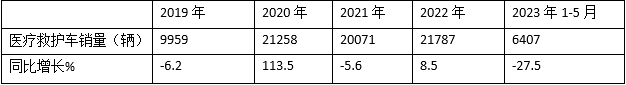 根據(jù)終端上牌信息,2023年1-5月醫(yī)療救護車累計銷售6407輛,同比增長-27.5%,其同比增幅創(chuàng)下近年新低(表1).