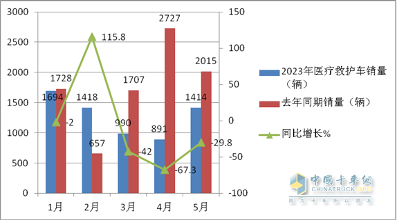 2023年1-5月各月醫(yī)療救護車銷量及同比(數(shù)據(jù)來源:終端上牌信息)