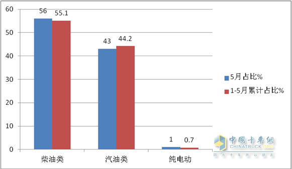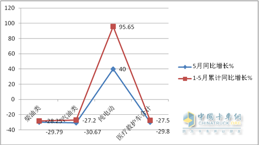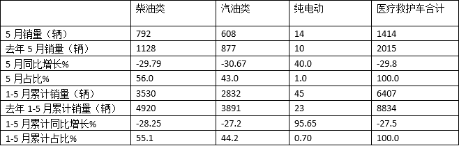 總之,按動力種類劃分,無論是今年5月還是1-5月,醫(yī)療救護車市場中柴油類車型均居榜首,純電動車型均領(lǐng)漲。