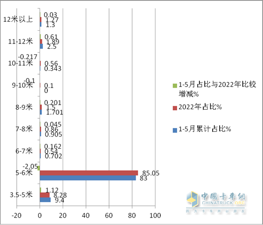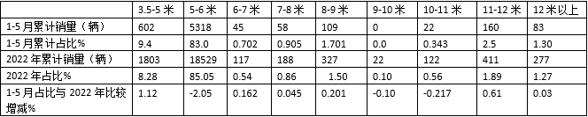 上圖表顯示,在今1-5月按長度段劃分,各個長度段救護車銷量占比呈現(xiàn)以下特點: