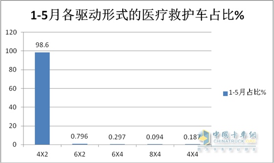---4x2類(2軸)救護車占比98.6%,居于絕對的壟斷地位,這類車型主要是5-6米、3.5-5米段小型救護車;