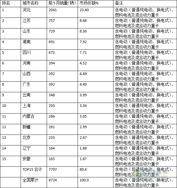一、 河北獨大,TOP15累計占比近9成---前5月新能源重卡省級區(qū)域流向情況簡析。