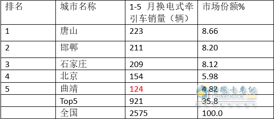 2、 今年前5月普通純電動牽引車流向TOP5城市(數(shù)據(jù)來源:終端上牌):