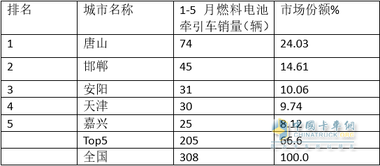 3、 今年前5月燃料電池電池牽引車流向TOP5城市(數(shù)據(jù)來源:終端上牌):
