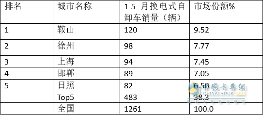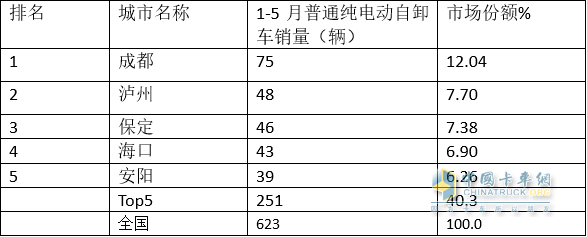 1、 今年前5月普通純電動自卸車流向top5城市(數(shù)據(jù)來源:終端上牌)