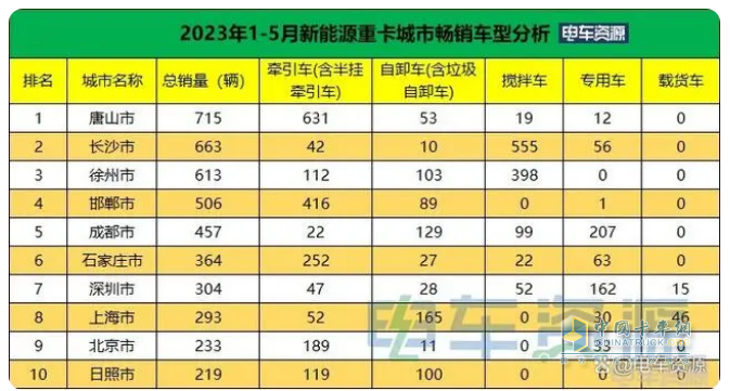 截圖1,2023年1-5月新能源重卡銷售 TOP10城市各類車型銷量統(tǒng)計(數(shù)據(jù)來源、:電車資源提供的上牌信息)。