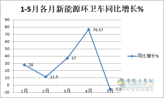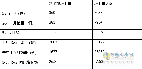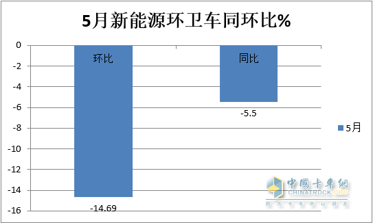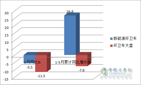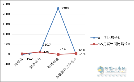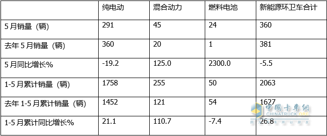 上圖表顯示:在今年5月及1-5月各類新能源環(huán)衛(wèi)車銷量同比中: