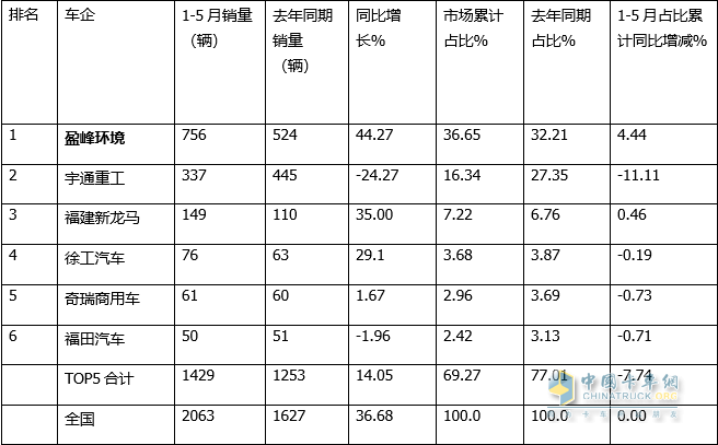 七、1-5月累銷中,盈峰環(huán)境、宇通重工、福建龍馬居TOP3;盈峰環(huán)境領(lǐng)漲領(lǐng)跑,表現(xiàn)最搶眼