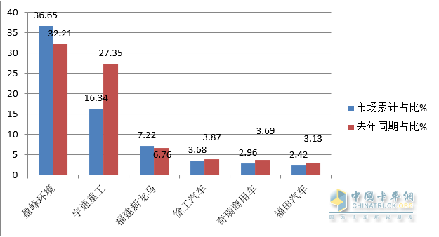上圖表可見,在今年1-5月新能源環(huán)衛(wèi)車銷量中,盈峰環(huán)境、宇通重工、福建龍馬居TOP3;徐工汽車、奇瑞商用車及福田汽車分別居第四、第五、第六。