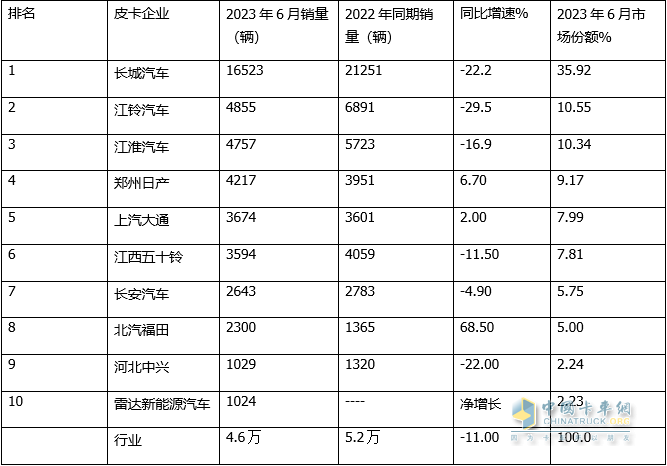根據(jù)乘聯(lián)會數(shù)據(jù),2023年6月皮卡銷量4.6萬輛,同比下降1成成多(-11%),環(huán)比微增1%。