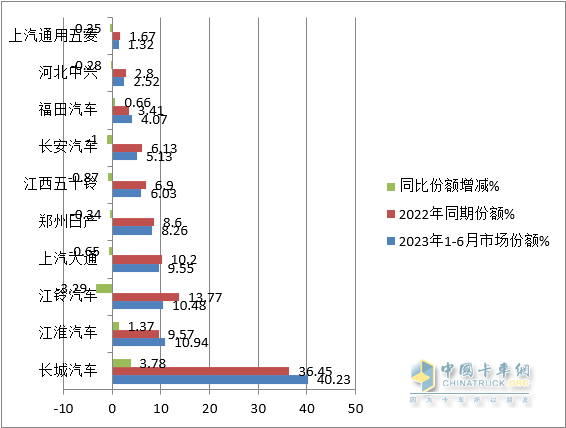 2、從2023年前6月皮卡TOP10市場份額及同比增減看: