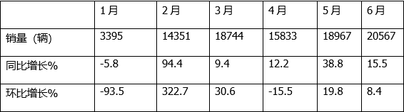 特點一:6月同環(huán)比“雙增長”,銷量首次突破2000輛創(chuàng)上半年各月新高