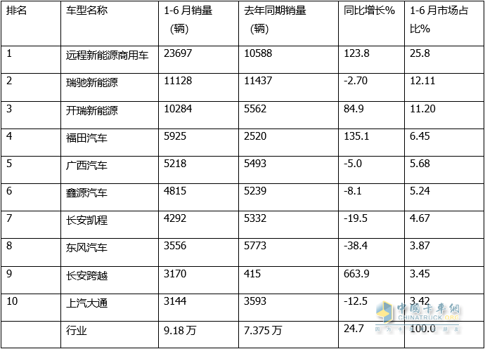 上表顯示,在2023年1-6月新能源物流車銷量TOP10中: