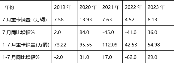 2023年7月重卡銷量6.13萬輛,在近5年同期中處于第四;居于下等水平 (銷量同比增長36%,增幅居近5年同期第二);